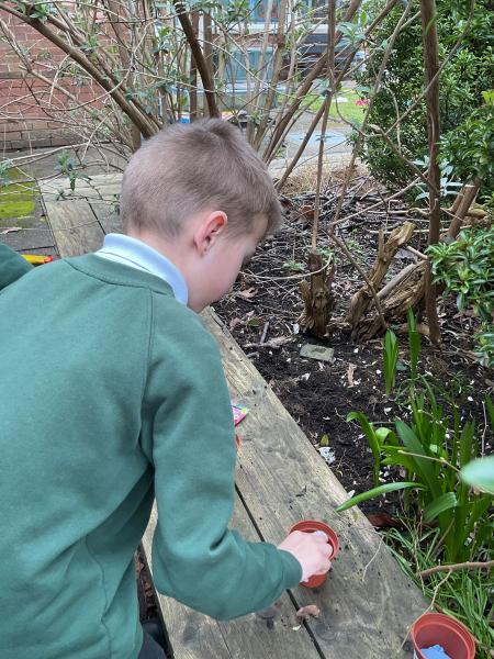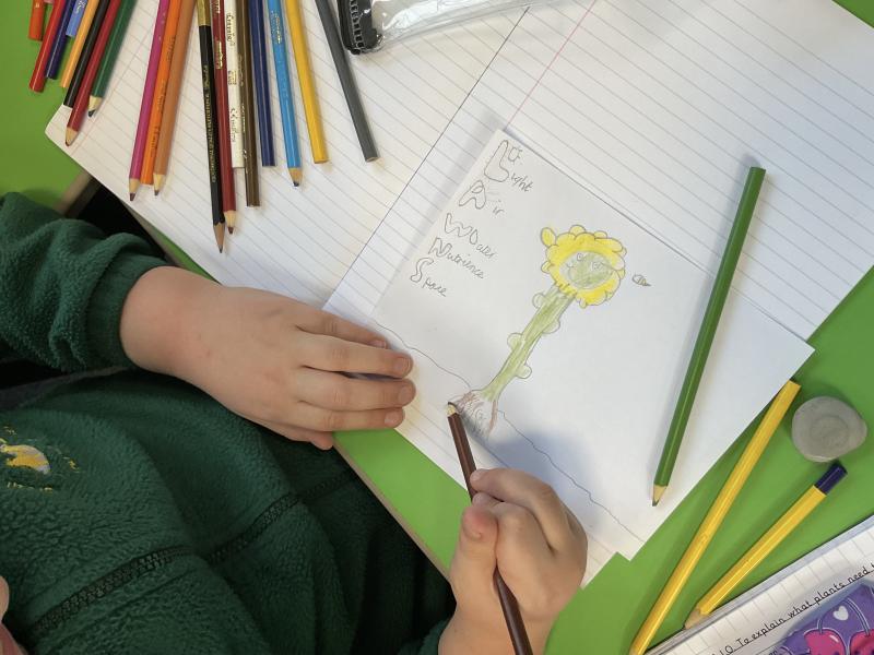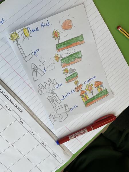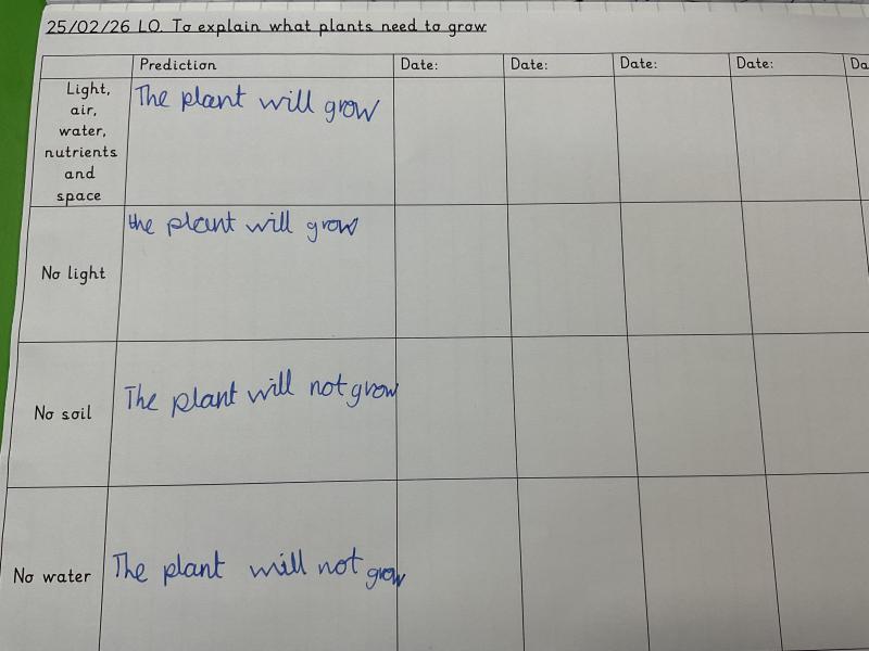 3A planted four seeds to see what plants need to grow. One seed will have light, air, water, nutrients, and space. One will have no soil. One will have no water. One will have no light.
